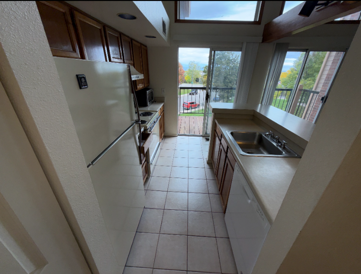 The vaulted ceiling and open floor plan invite you right into this home. Floor to ceiling windows allow for beautiful views of the trees and invite natural light inside. The kitchen offers a large bar, perfect for entertaining! Ceiling fan helps keep you cool!